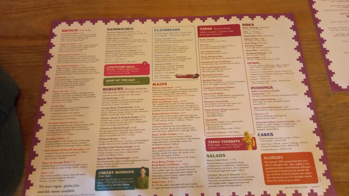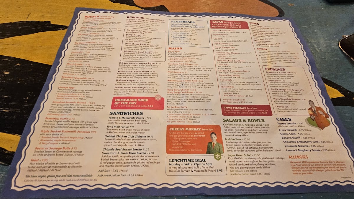 Start your morning with a full English breakfast or opt for something lighter like eggs benedict or a veggie breakfast. Midday or early evening visitors might enjoy one of their crafted sandwiches, such as the twisted chicken club ciabatta or a lounge bacon cheeseburger, paired with fries or a refreshing raspberry mojito. For those looking for something heartier but plant-based, options like the vegan Sri Lankan curry or dan dan cauliflower noodles offer satisfying flavors that complement the relaxed, welcoming atmosphere.